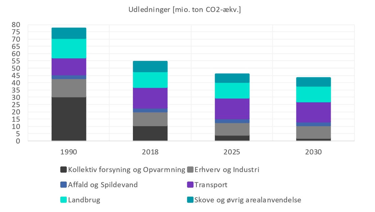 Figur 2: Energistyrelsens fremskrivning af de samlede udledninger fordelt på sektorer 1990-2030 (mio. ton CO2e)