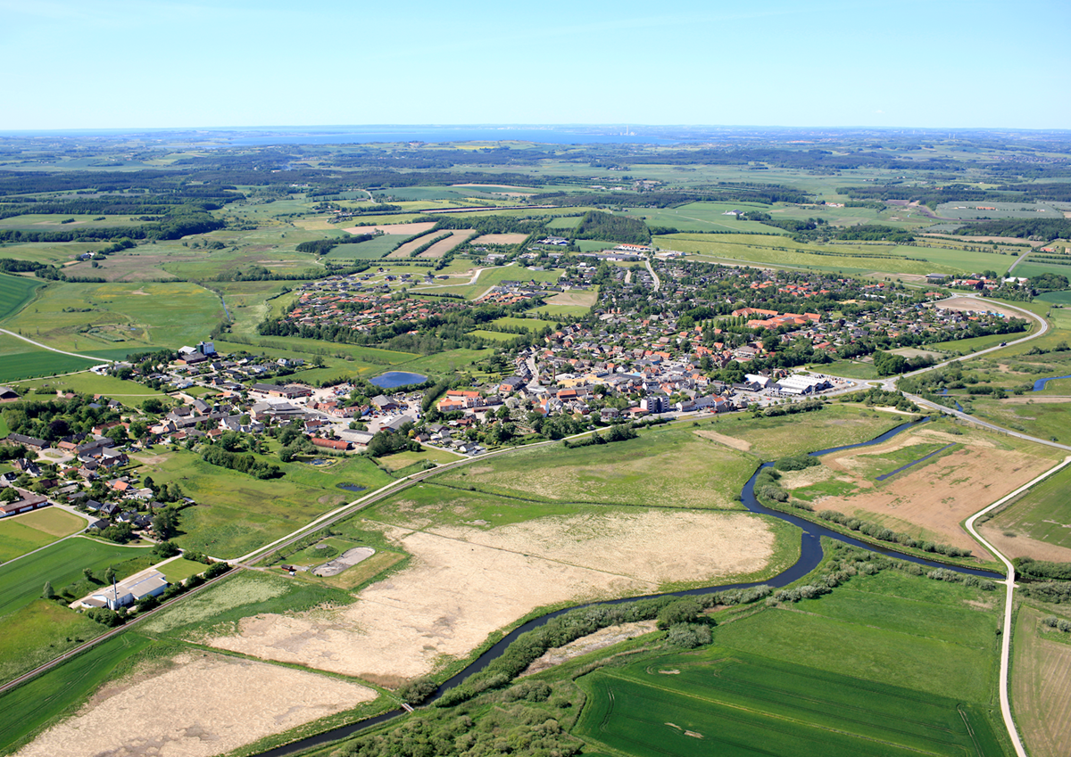 Luftfoto fra Kolind, der viser nærheden til vandet og de muligheder og udfordringer, dette giver.