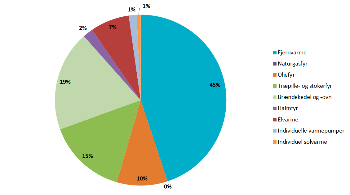 Elvarme til opvarmning af boliger og fritidshuse udgør 7 %, oliefyr 10 % og de resterende 38 % kommer fra andre brændselskilder.