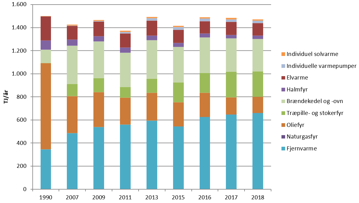Den høje andel skyldes, at vi i Syddjurs allerede har omstillet fjernvarmen fra kul til biomasse og udskiftet fossile varmekilder i boliger til vedvarende energikilder, jf. figur 5. Effekten af omstilling af individuel opvarmning til fjernvarme ses tydeligt. Fra 1990 til 2018 er der sket en lille reduktion i energiforbruget på opvarmning af boliger og fritidshuse på ca. 5 % på trods af stigning i antal boliger. Det må tilskrives energirenoveringer og mere effektive varmekilder.