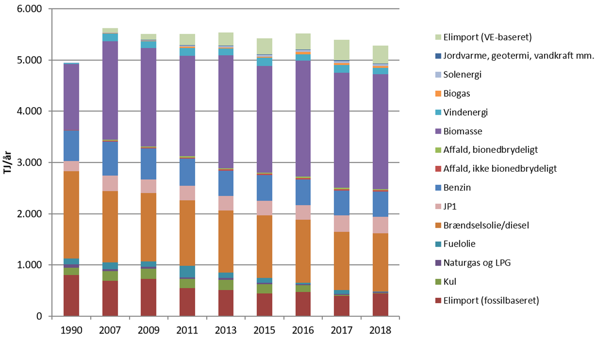 Det totale forbrug af energi er fordelt på brændselskilderne: Importeret el, olie, naturgas, biomasse og vedvarende energi (VE). Fordelingen er vist i figur 6 til 9. Energiforbruget er primært baseret på olie, biomasse og importeret el. Andelen af vedvarende energikilder er svagt stigende i forhold til de fossile kilder.