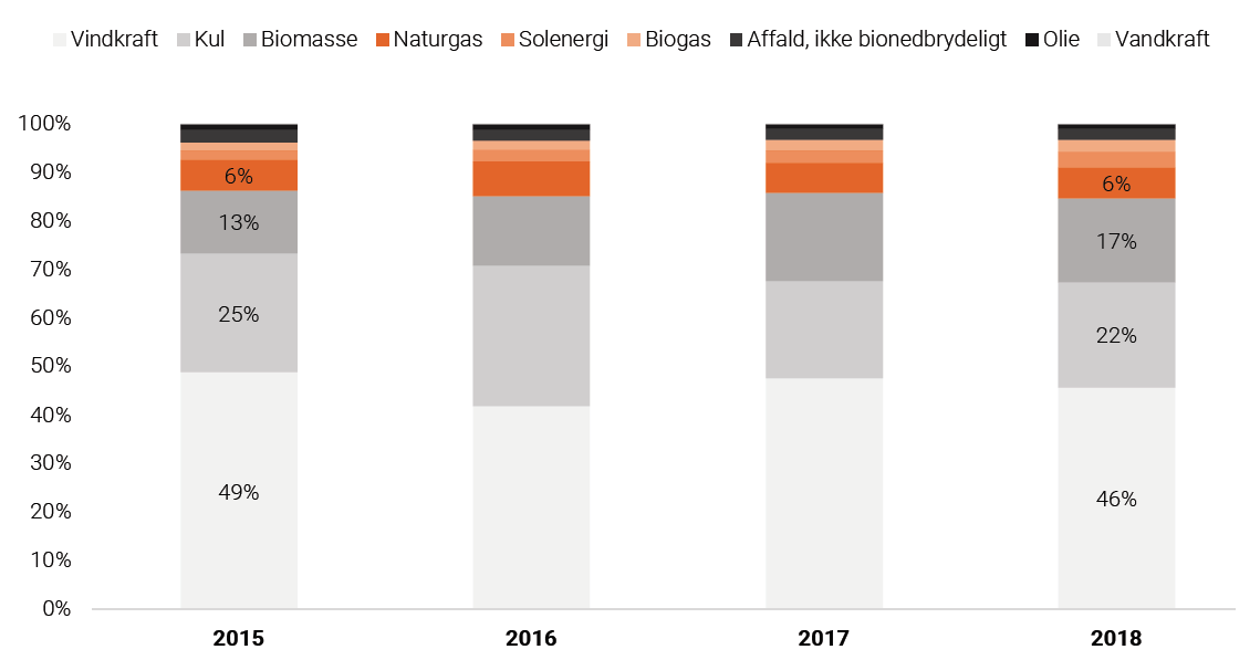 Andelen af vedvarende el er dog stadig lille i forhold til behovet. Udfordringen er at få sat gang i grønne investeringer i vedvarende energi svarende til den omstilling, der er sket inden for varmeforsyning. Figur 10 viser den samlede danske elproduktion fra 2015-2018 fordelt på brændselskilder.